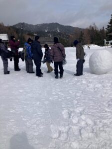 標高約1,200mのゲレンデで、サラサラの雪をぎゅっと固めて作った雪玉を転がしながら